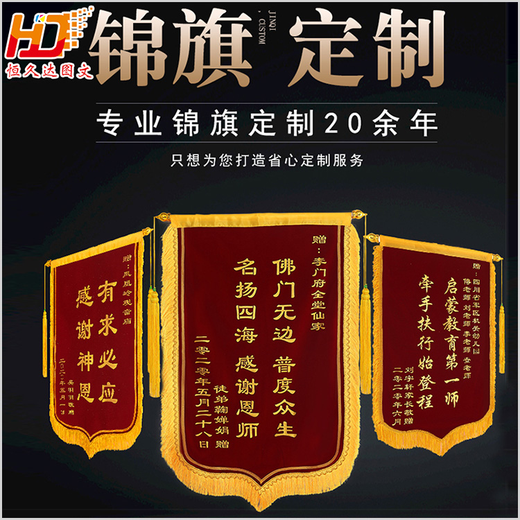 專業(yè)制作條幅、錦旗、綬帶,可加急定制。 【錦旗常用尺寸】60*90、70*110,材質(zhì)常用:發(fā)泡錦旗、金粉、燙金等材質(zhì)